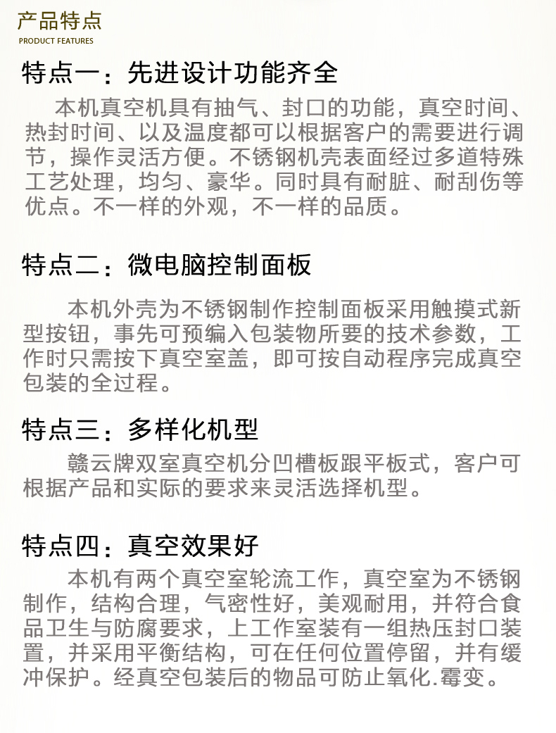 贛云牌真空包裝機(jī)是一種新穎的包裝機(jī)械,它是將包裝袋內(nèi)抽成真空后、立即自動封口,袋內(nèi)真空度高,殘留空氣少,防止了細(xì)菌等微生物的繁殖、避免了物品氧化霉變和腐敗、同時(shí)對某些松軟的物品、經(jīng)人包裝后、可縮小包裝體積、便于運(yùn)輸和貯存。