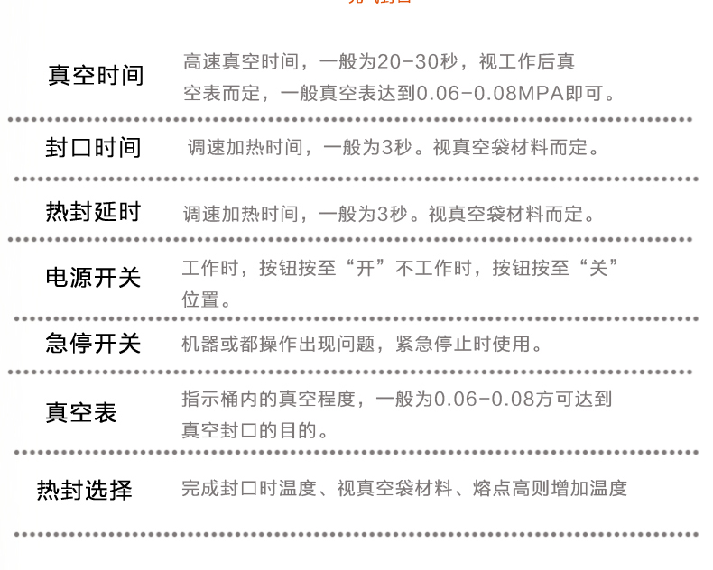 4、當(dāng)抽氣時(shí)間達(dá)到預(yù)設(shè)定時(shí)間時(shí),抽氣結(jié)束,指示燈隨之熄滅,熱封指示燈亮,此時(shí)電磁閥工作,進(jìn)入封口程序,面板上舍友熱封時(shí)間及溫度調(diào)節(jié)按鈕,以適應(yīng)不同厚薄的材料,調(diào)節(jié)時(shí)間及溫度應(yīng)注意一定根據(jù)所需的包裝袋規(guī)格來調(diào)整。