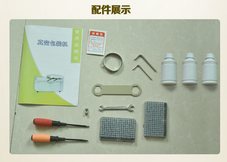 2、將所需包裝的物品裝入包裝袋【塑料復(fù)合袋或鋁箔復(fù)合袋】內(nèi),放入真空室內(nèi),提起壓條,均勻的把袋口置于熱封架上排好,然后放下壓條。
