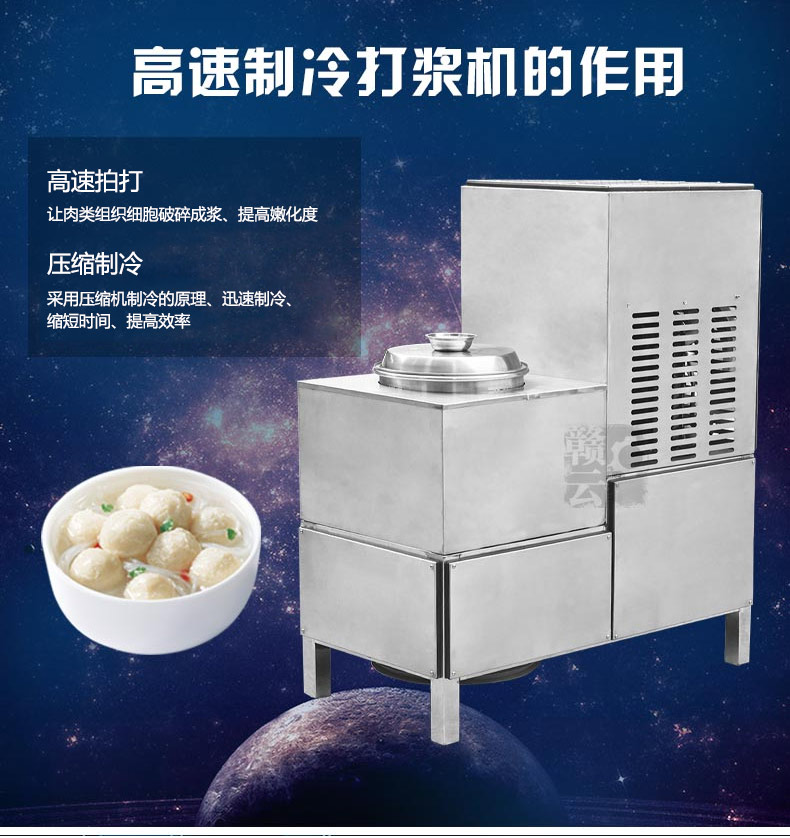 本設(shè)備采用304不銹鋼材質(zhì)加工設(shè)計,在原高速/慢速打漿機的基礎(chǔ)上,將3P制冷壓縮機嵌入打漿機內(nèi),解決了高速/慢速肉丸打漿過程中因拍打破碎等工序引起升溫改變?nèi)赓|(zhì)難題,制冷效果顯著,產(chǎn)品一經(jīng)推出,倍受肉制品加工商企客戶青睞。
