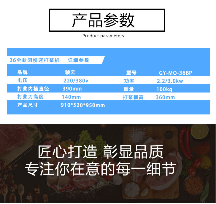 贛云牌36型全封閉式慢速變頻肉丸打漿機(jī)選優(yōu)質(zhì)不銹鋼,在全不銹鋼慢速肉丸打漿機(jī)基礎(chǔ)上將整機(jī)外殼用不銹鋼板材封裝,更好的保護(hù)電動(dòng)機(jī),通過(guò)小皮帶輪帶動(dòng)大皮帶輪減速,慢速拍打肉漿。