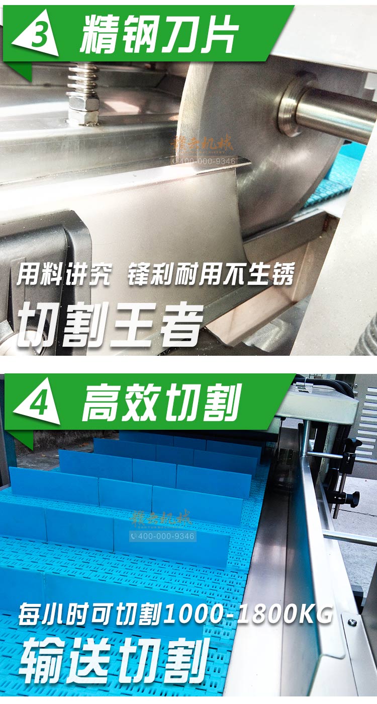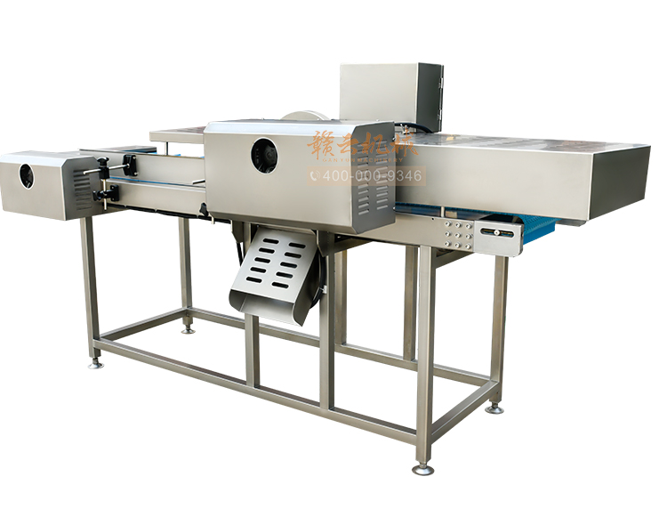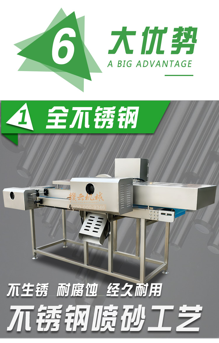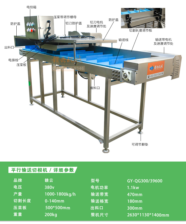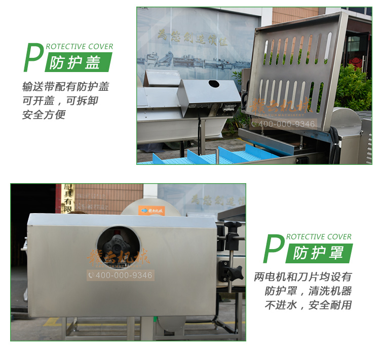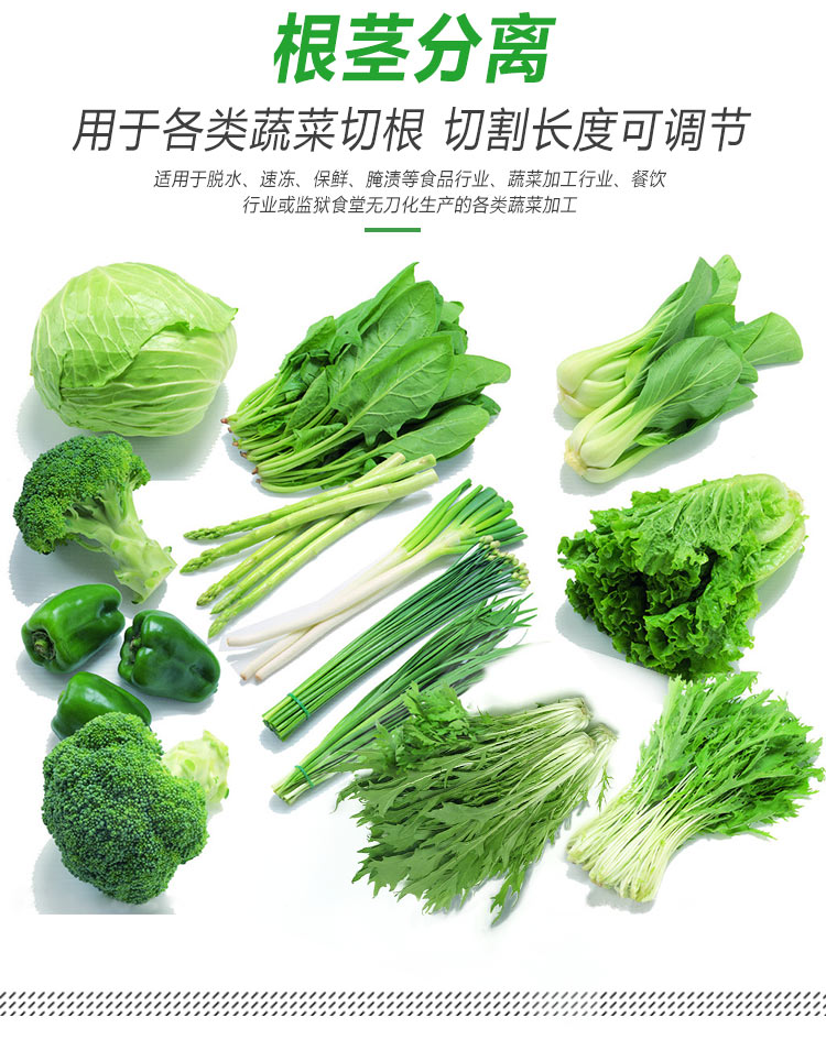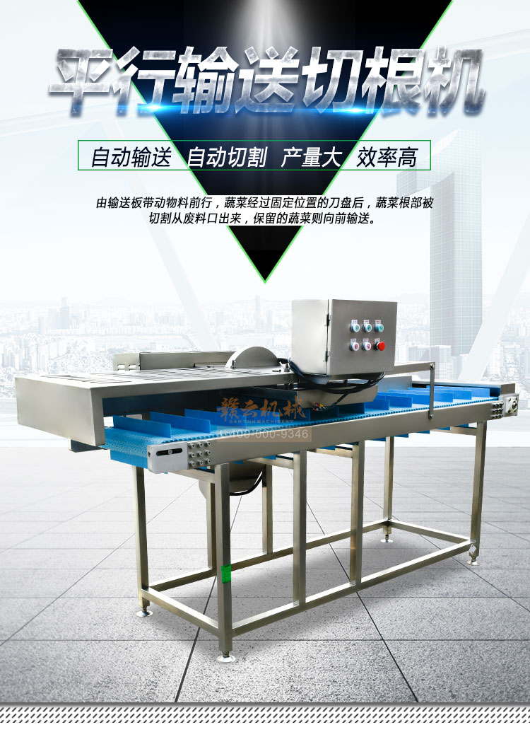平行輸送去根機由輸送板帶動物料前行,蔬菜經過固定位置的刀盤后,蔬菜根部被切割從廢料口出來,保留的蔬菜則向前輸送。切割的長度可以調節(jié),每顆蔬菜所切割出來的廢料都相等。去根機適合大型食品加工廠、凈菜生產線等。