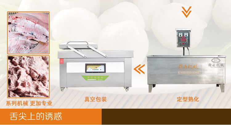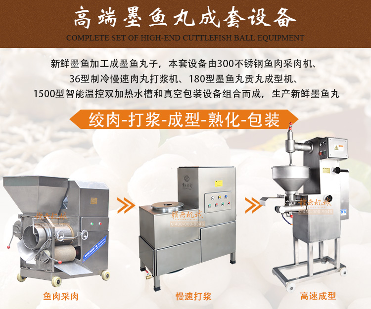墨魚丸成套,新鮮墨魚加工成墨魚丸設(shè)備,墨魚丸機,本套設(shè)備由300不銹鋼魚肉采肉機、36型制冷慢速肉丸打漿機、180型墨魚丸貢丸成型機、1500型智能溫控雙加熱水槽和真空包裝設(shè)備組合而成,生產(chǎn)新鮮墨魚丸