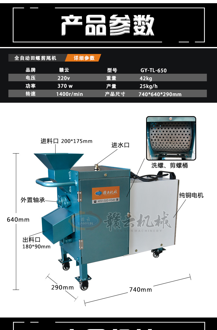 田螺剪尾機(jī)原理適用于菜場(chǎng)、飯店加工螺螄,減少人力。只需將螺螄倒入進(jìn)料口,啟動(dòng)電源運(yùn)轉(zhuǎn)5分鐘,剪完后往進(jìn)口沖1-2次水,停機(jī)拉開(kāi)閘門即可