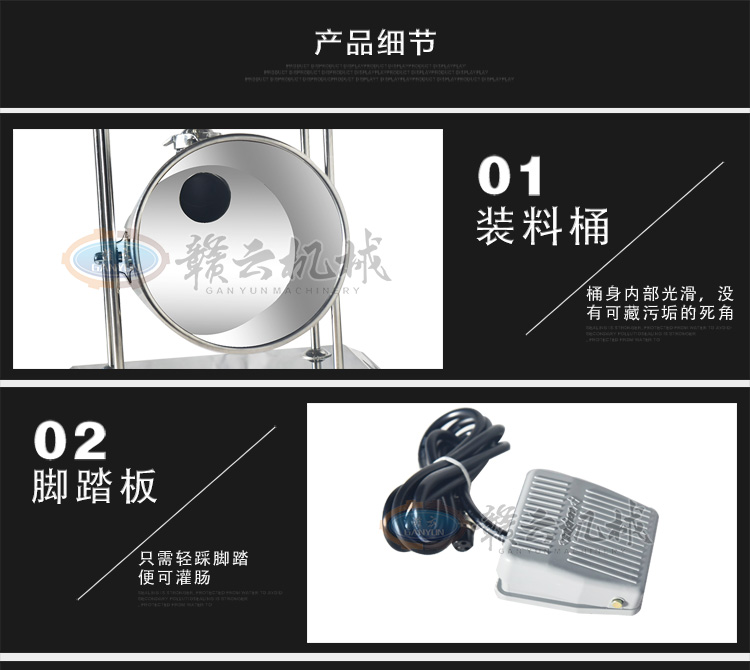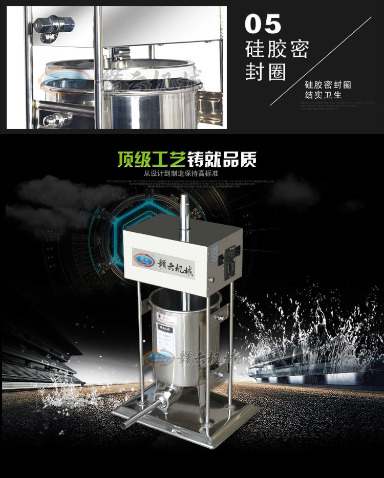 冬季灌腸新添專業(yè)灌腸設(shè)備,贛云牌立式不銹鋼電動灌腸機(jī),專業(yè)灌制各種腸類,如臘腸、香腸、火腿腸、親親腸。變頻速度可調(diào),灌腸讓你隨心所欲,整機(jī)采用全齒輪優(yōu)質(zhì)拉桿升降系統(tǒng)設(shè)計.腳踏開關(guān)隨意控制,配合自動升降系統(tǒng)及變速可調(diào),灌腸速度快,效果好。