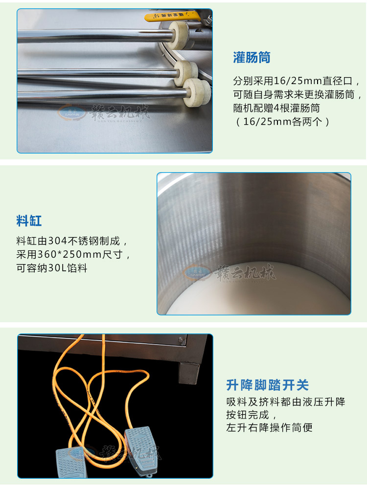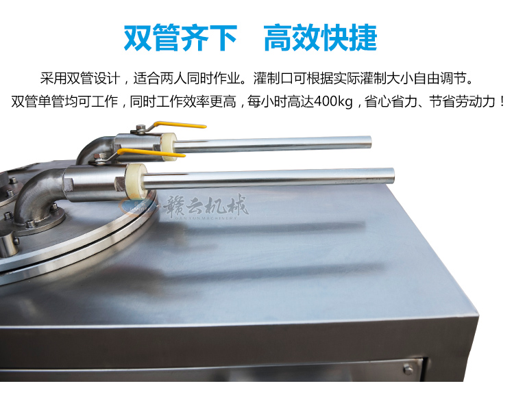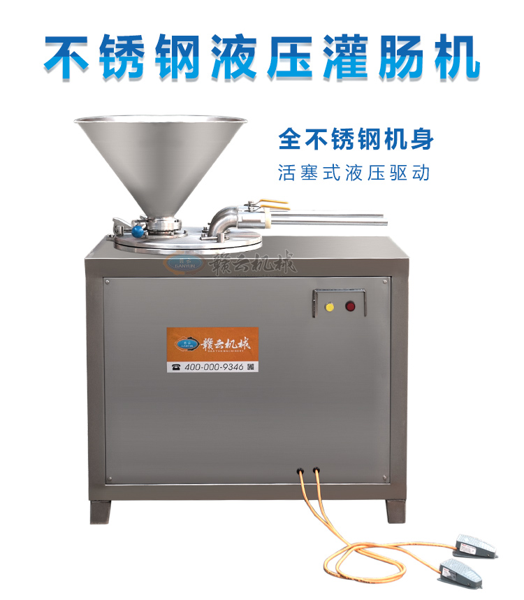贛云液壓灌腸機(jī),新款灌漿機(jī),雙管灌腸機(jī)采用液壓灌漿推料原理設(shè)計(jì),密封性能良好,配合雙管灌漿,可自動(dòng)調(diào)節(jié)灌漿,自動(dòng)吸料,腳踏開(kāi)關(guān)控制操縱自如。是腸類灌腸設(shè)備。