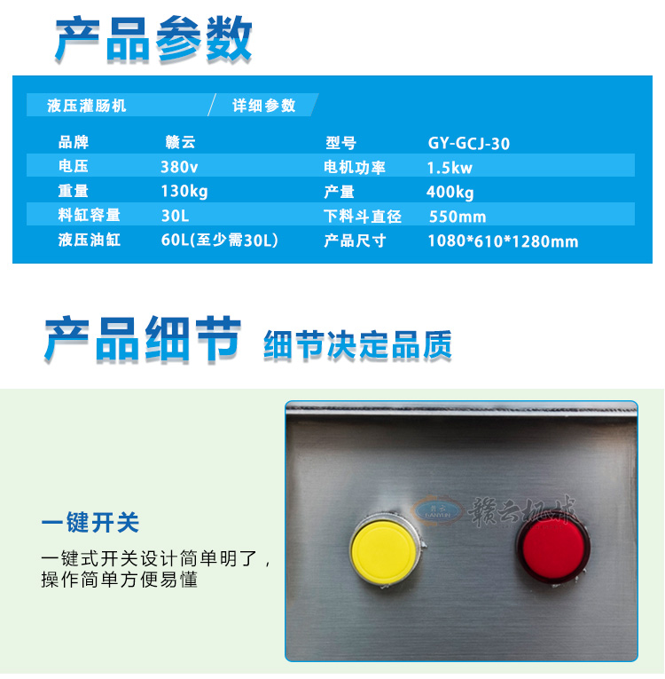 贛云食品機(jī)械旗下液壓灌腸機(jī),新款灌漿制腸,此款雙管灌腸機(jī)采用液壓灌漿推料原理設(shè)計(jì),設(shè)備密封性能良好,配合雙管灌漿提高灌腸產(chǎn)量,設(shè)備可自動(dòng)調(diào)節(jié)灌漿,自動(dòng)吸料,腳踏開(kāi)關(guān)控制讓人操縱自如。是一款實(shí)用的灌漿制腸設(shè)備。 注意事項(xiàng):首次使用前必須加入一桶16KG的46#液壓油