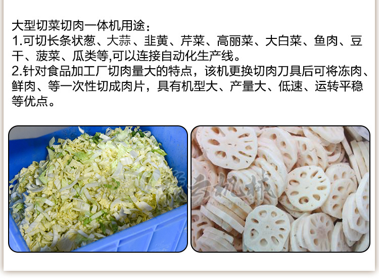 大型切菜切肉一體機(jī)用途可切長(zhǎng)條狀蔥、大蒜、韭黃、芹菜、高麗菜、大白菜、魚(yú)肉、豆干、菠菜、瓜類(lèi)等、可以連接自動(dòng)化生產(chǎn)線。針對(duì)食品加工廠切肉量大的特點(diǎn),該機(jī)更換切肉刀具后可將凍肉、鮮肉、等一次性切成肉片,具有機(jī)型大、產(chǎn)量大、低速