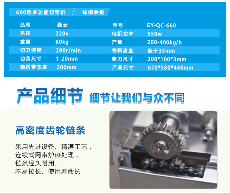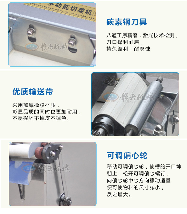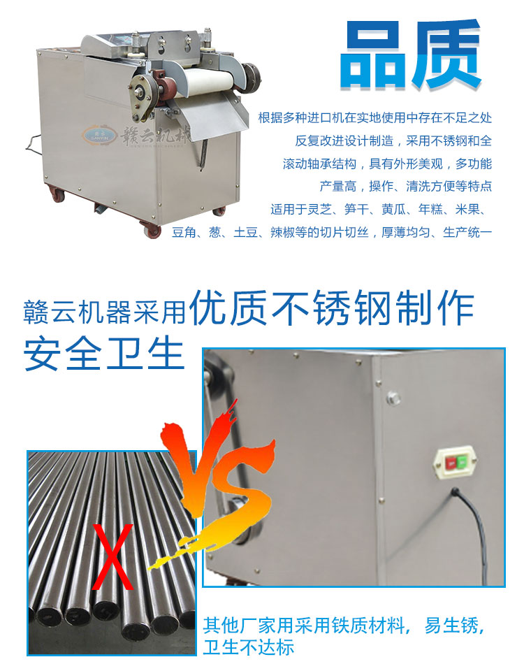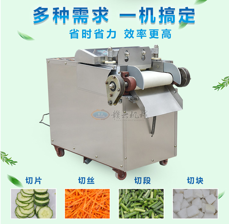 贛云牌多功能切菜機是根據(jù)多種樣機在實地使用中存在不足之處,反復(fù)改進(jìn)設(shè)計制造,采用不銹鋼和全滾動軸承結(jié)構(gòu),具有外形美觀,成熟可靠,使用維修方便等特點。適用直蔬菜脫水、速凍、保鮮、腌漬等食品行業(yè)各類蔬菜。刀片距離可調(diào)節(jié)在0.1cm-2cm之間即切片、丁、絲厚薄在0.1cm-2cm。