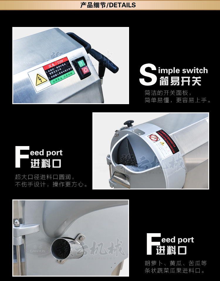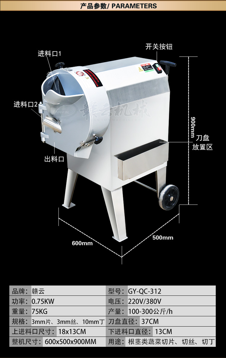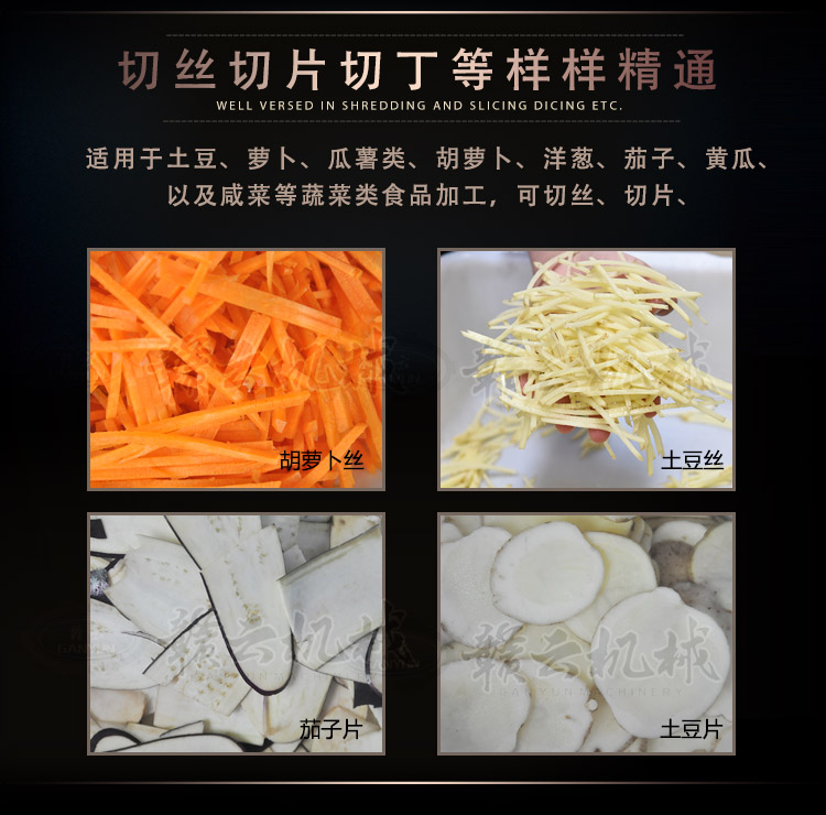 適用于土豆、蘿卜、瓜薯類、胡蘿卜、洋蔥、茄子、黃瓜以及咸菜等蔬菜類食品加工、可切絲、切片。