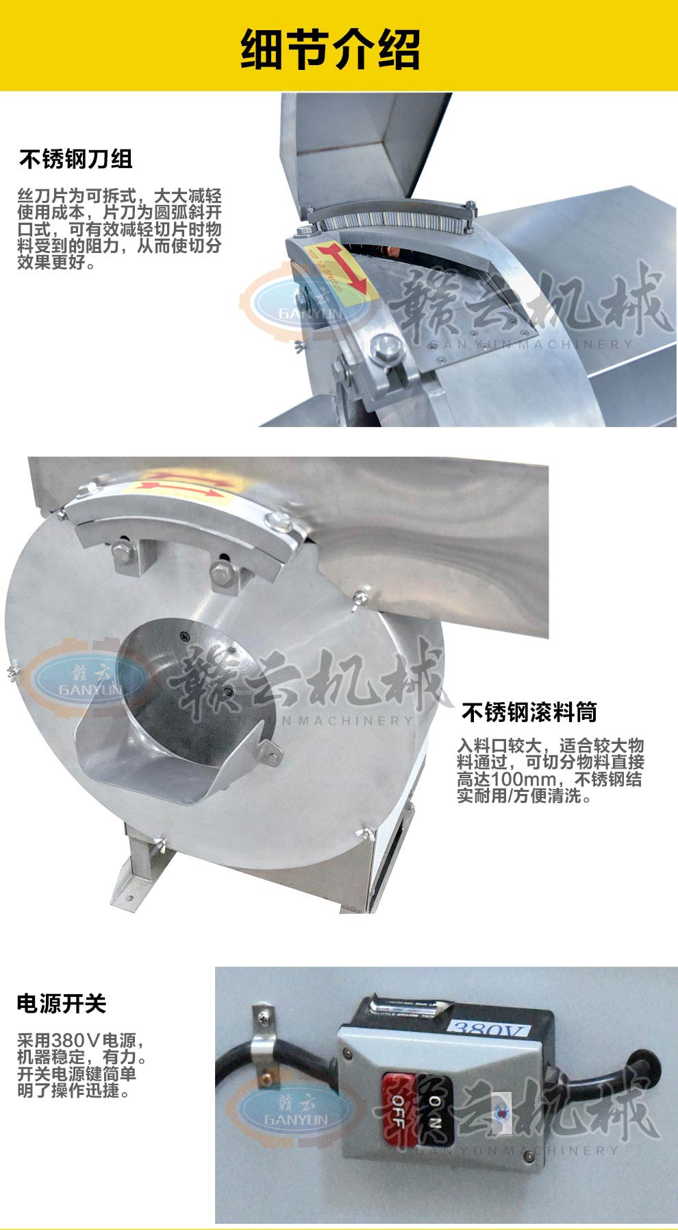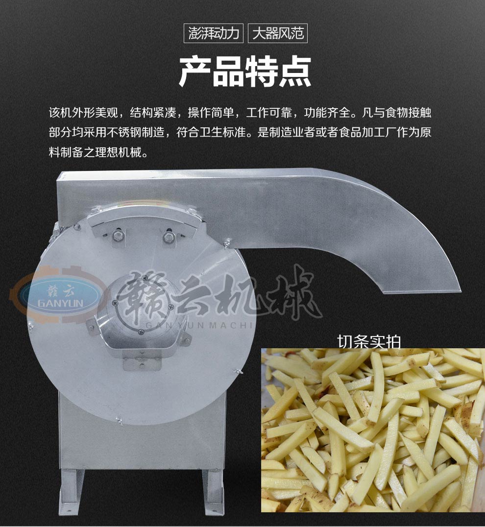 產(chǎn)品簡(jiǎn)介:GY-ST-502切薯?xiàng)l薯片機(jī)主要用于將塊莖類的果蔬切成片狀或是條狀,刀片采用優(yōu)質(zhì)不銹鋼材料制造,鋒利無比,使切削出來的薯?xiàng)l薯片表面光滑。本機(jī)操作簡(jiǎn)單,效率高,便于清潔。機(jī)器外部全部采用不銹鋼與鋁合金制造,所有與食物接觸的零部件均采用不銹鋼和鋁合金材料制作,主要用于薯?xiàng)l加工、酒店、餐飲店和相關(guān)的食品加工行業(yè)。
