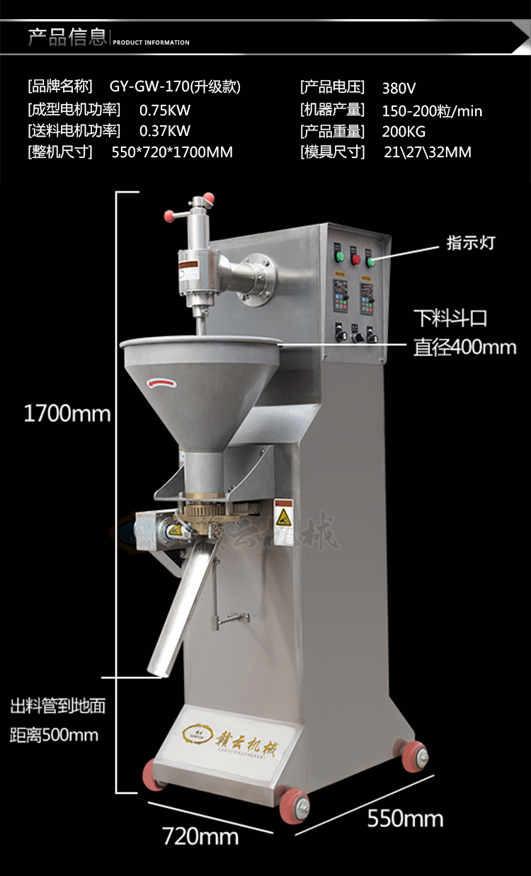 贛云牌貢丸成型機采用雙速系統(tǒng),推料和挖出成型各用一個電機,挖出成型采用半球形舀勺仿人工制作,設(shè)計科學(xué)合理,采用全不銹鋼材質(zhì),符合食品衛(wèi)生加工要求貢丸大小由模具控制,每分鐘可加工成型200粒貢丸,機器的操作和清洗都很方便。隨機配成型模具:27mm、21mm和32mm??啥ㄖ?8mm,34mm模具哦。