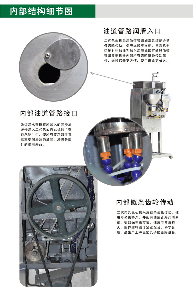 第二代包心機(jī)在第一代包心機(jī)的基礎(chǔ)上做了很大改進(jìn),1、材質(zhì)方面,一代包芯機(jī)采用430不銹鋼材質(zhì),二代包芯機(jī)使用304不銹鋼板材,外觀上更顯檔次;2、潤(rùn)滑系統(tǒng),一代包芯機(jī)采用皮帶和齒輪傳動(dòng),無潤(rùn)滑系統(tǒng),一般壽命3-5年,而二代肉丸包芯機(jī)采用鏈條和齒輪傳動(dòng),并配有油道管路潤(rùn)滑系統(tǒng),使用壽命是肉丸包芯機(jī)的兩倍之多