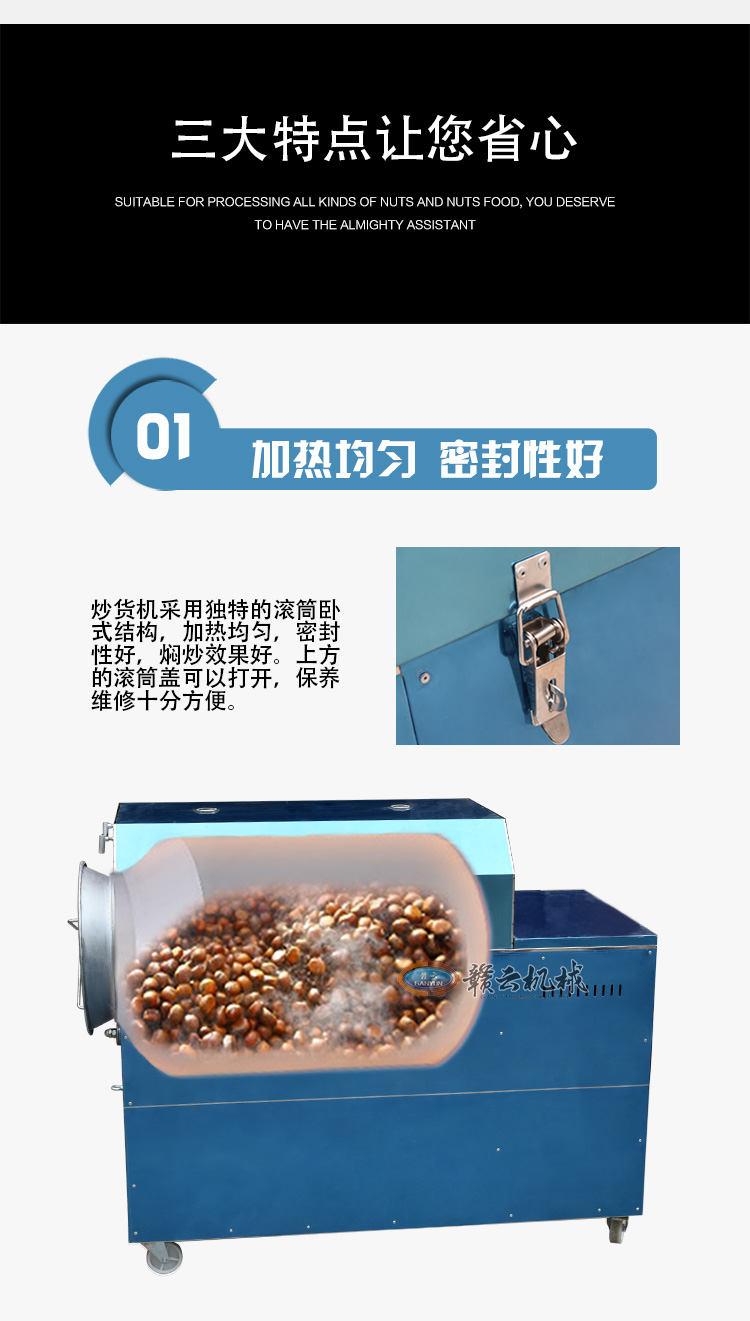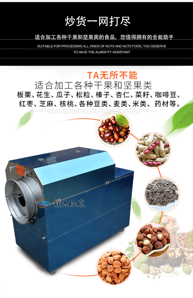 炒貨出入鍋十分方便,只需按動(dòng)正反轉(zhuǎn)開關(guān),電機(jī)既帶動(dòng)滾筒反轉(zhuǎn),炒貨和小石子會(huì)一同出鍋,自動(dòng)分離,迅速快捷,省事不費(fèi)力,干凈又衛(wèi)生。是一種值得廣大中小投資者關(guān)注的好設(shè)備,適合于炒貨廠、商場、菜市場、超市居民區(qū)農(nóng)村集市等固定經(jīng)營,也可流動(dòng)現(xiàn)炒。