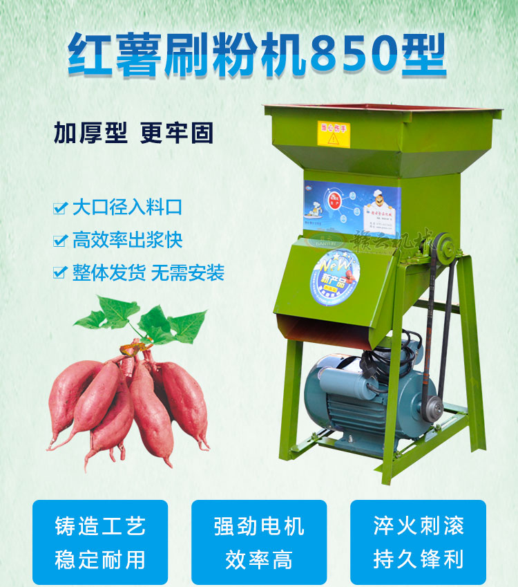 紅薯刷粉機(jī)適用于加工番薯/紅薯、木薯、馬鈴薯、蕉藕、芋頭及其它塊根作物的磨碎作業(yè),加工成粉。適用于山區(qū)、半山區(qū)的糧食加工廠及普通用戶。可配用220V的1.5KW電機(jī)使用,也可配用柴油機(jī),目前價(jià)格配的是國(guó)標(biāo)銅線電機(jī)!