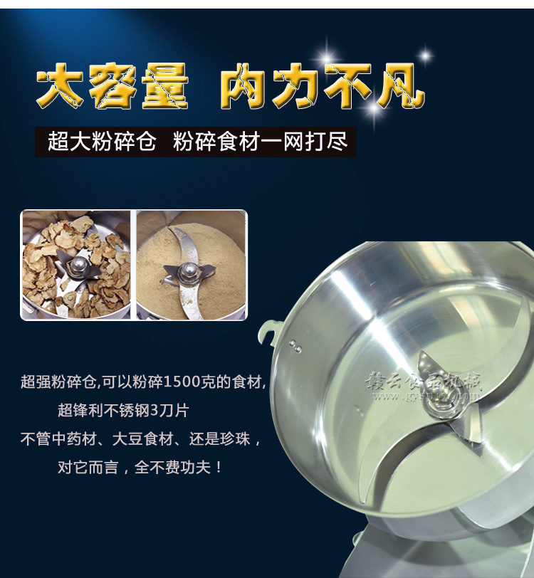贛云系列多功能粉碎機(jī)采用純銅高速電機(jī)帶動(dòng)粉碎刀片將物料快速打成粉末,可用于粉碎五谷、雜糧、田七、阿膠、白叁等,一般粉碎時(shí)間1-2分鐘即可,新款粉碎機(jī)改保險(xiǎn)絲為空氣過(guò)載保護(hù)器,使用更安全,我廠提供的粉碎機(jī)有100克-1000克不同型號(hào)的多功能粉碎機(jī)。