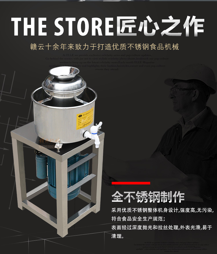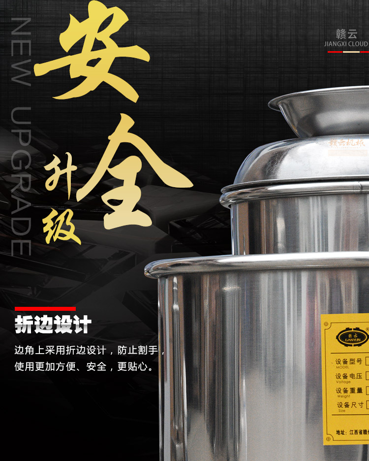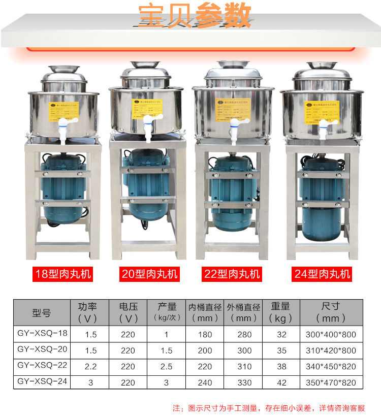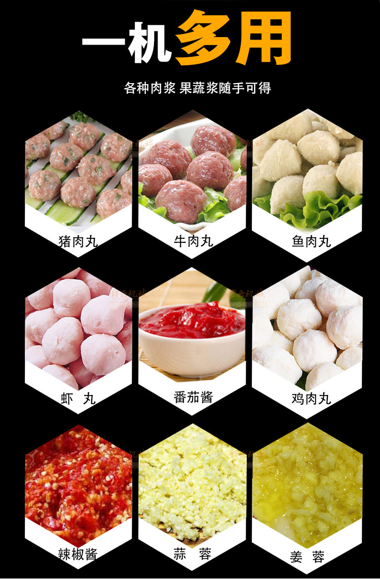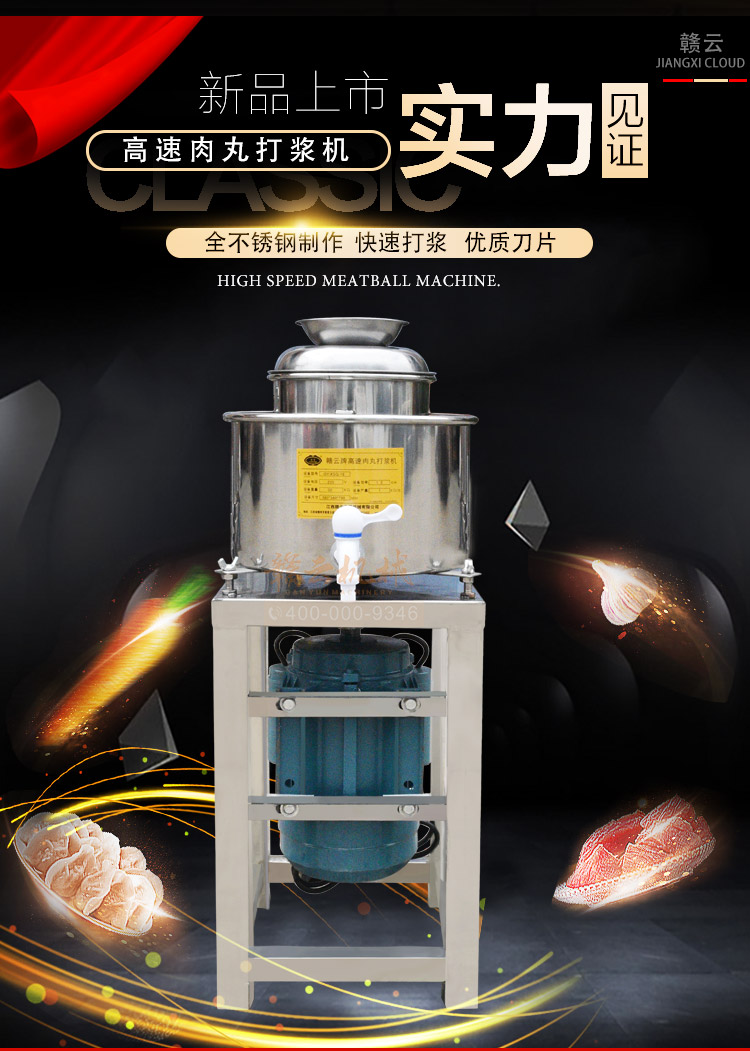 贛云牌新款全不銹鋼肉丸機,18型肉丸機采用全不銹鋼材質(zhì),在舊款全不銹鋼肉丸機的基礎(chǔ)上給支撐架加粗加厚,用不銹鋼蓋,打漿雙桶,刀柄刀片均采用不銹鋼材質(zhì)。打漿桶裝肉量1L,一次可打肉漿1-2斤左右,采用2800r/min高速電機,故稱之為高速肉丸機。