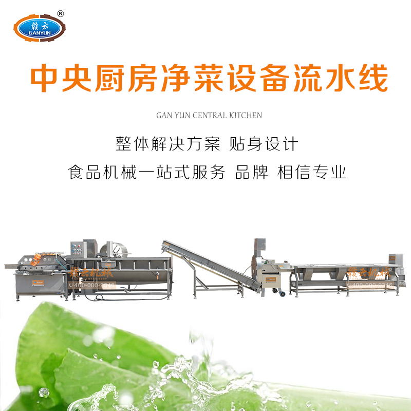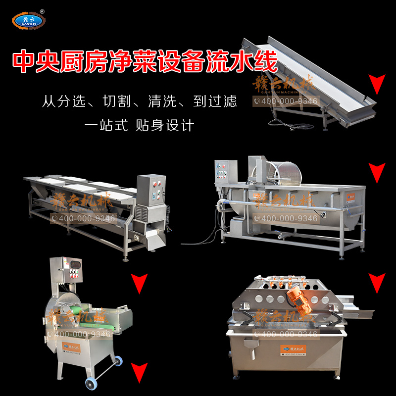 中央廚房凈菜設備流水線_食堂凈菜加工流水線_食堂切配成套設備_贛云掌握中央廚房凈菜設備核心技術,本套設備由分選輸送設備、數(shù)字多元化切配設備、提升設備、渦流臭氧清洗去農藥殘留設備、高頻振動機組合而成,可根據客戶需求定制中大型流水線。