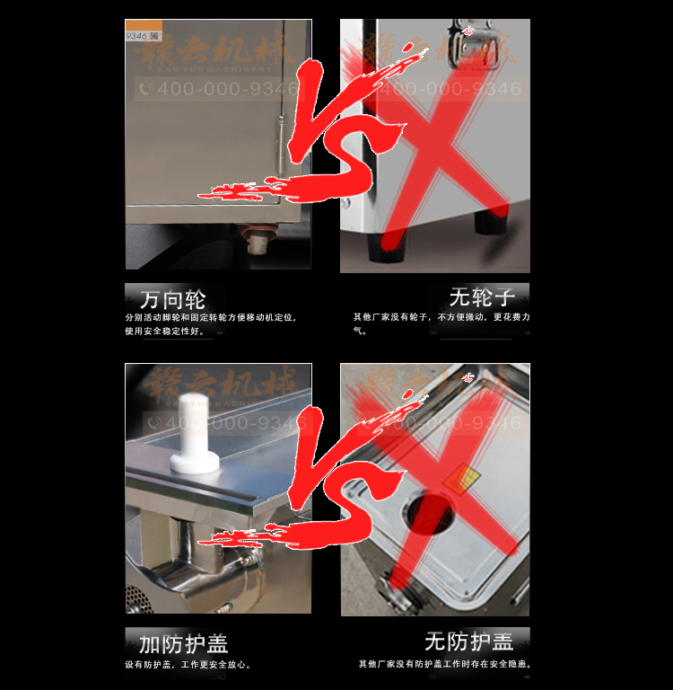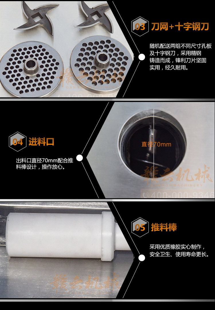 贛云牌32型不銹鋼立式絞肉機(jī),防水開關(guān),二級(jí)減速,齒輪鏈條傳動(dòng),接觸食品部位全部不銹鋼材質(zhì),配6mm、8mm刀網(wǎng),兩個(gè)十字刀,并配實(shí)心推料棒!絞肉就是不一樣。