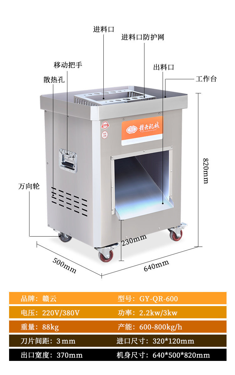 贛云工程款切肉機,可以切各種肉類,切片、切絲、切末一機搞定,也可以切軟蔬菜,例如:榨菜、魔芋、香菇、辣椒等,贛云新款切肉機配置新升級,使用優(yōu)質(zhì)大功率電機,采用不銹鋼機身,機器機身清洗方便,增加安全防護,加大了入料口,增加工作效率,新款商用切肉機一機多能,可以滿足多樣需求。
