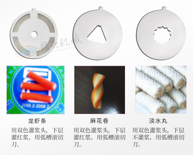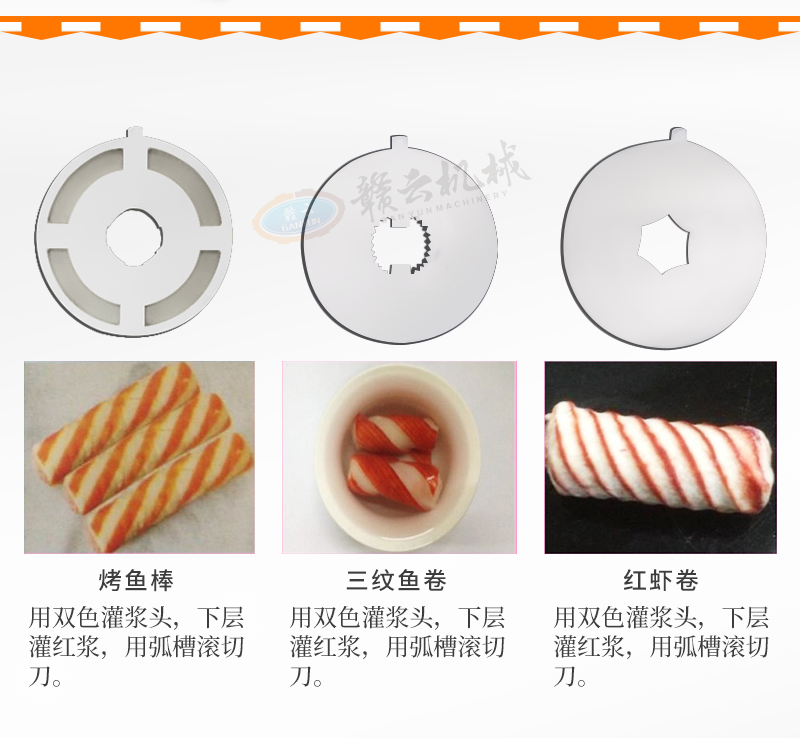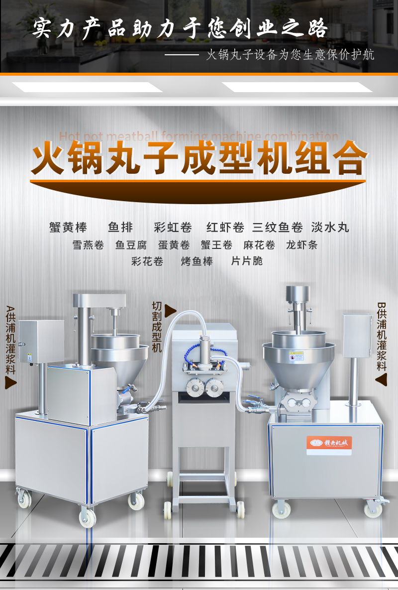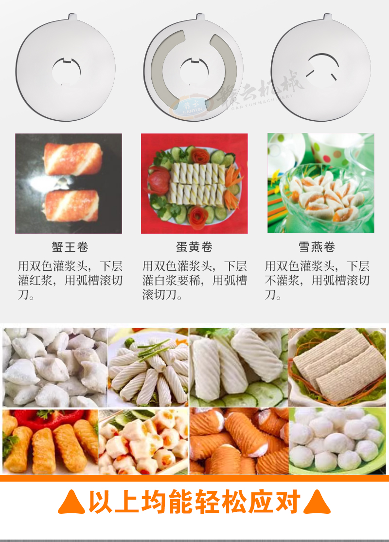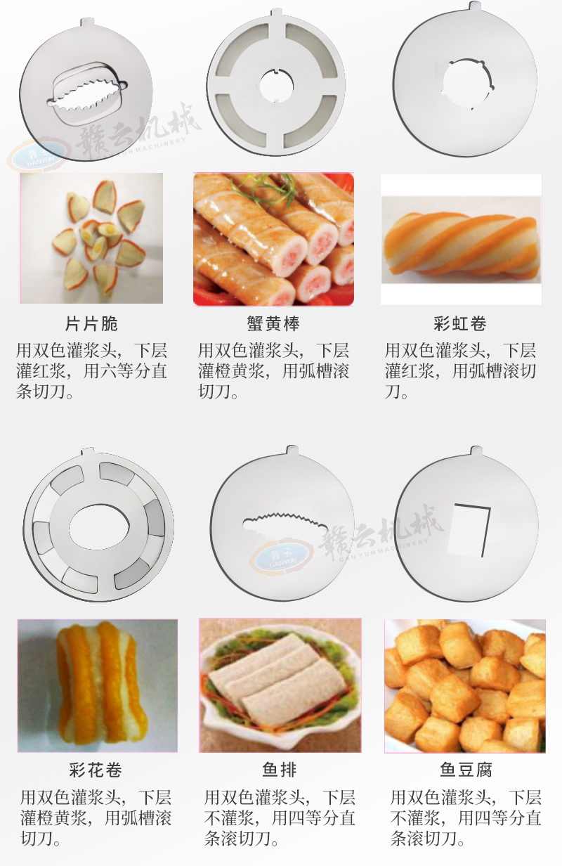 適用于:蟹黃棒、魚排、彩虹卷、紅蝦卷、三紋魚卷、淡水丸、雪燕卷、魚豆腐、蛋黃卷、蟹王卷、麻花卷、龍蝦條、彩花卷、烤魚棒、片片脆等多種火鍋丸子的加工生產(chǎn)。
