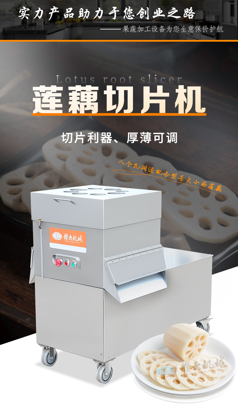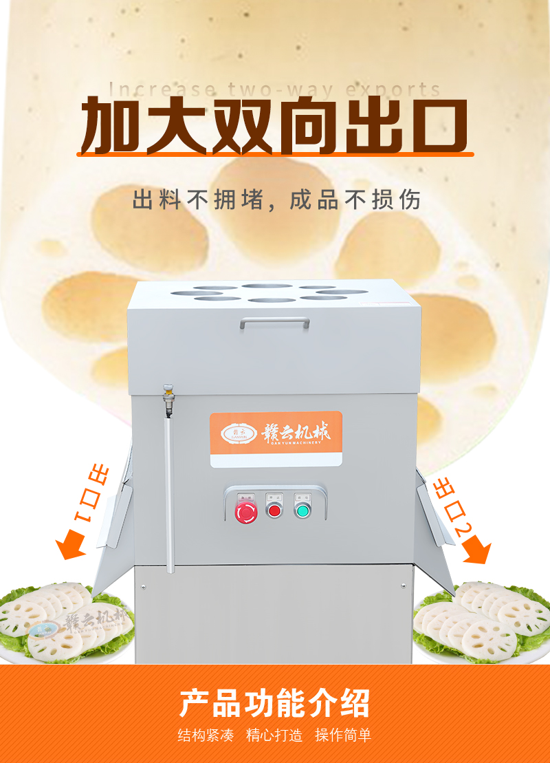蓮藕切片機專為土豆、蓮藕、白蘿卜、檸檬、蘋果、胡蘿卜、西紅柿、獼猴桃等果蔬切片。采用下壓式設(shè)計,食品級不銹鋼材質(zhì),整體操作簡單,清洗方便,安全耐用。采用雙切刀進行切片,八孔入料設(shè)計,大大提升了切片效率。這款高效的蓮藕切片機,適用于商用廚房、中央廚房、營養(yǎng)餐供餐中心、食堂、食品廠等,幫助您快速完成各種水果或球根莖類蔬菜的快速切片加工。