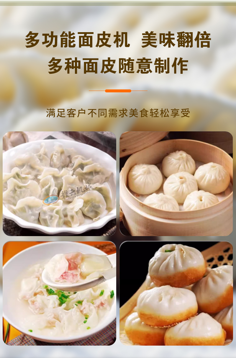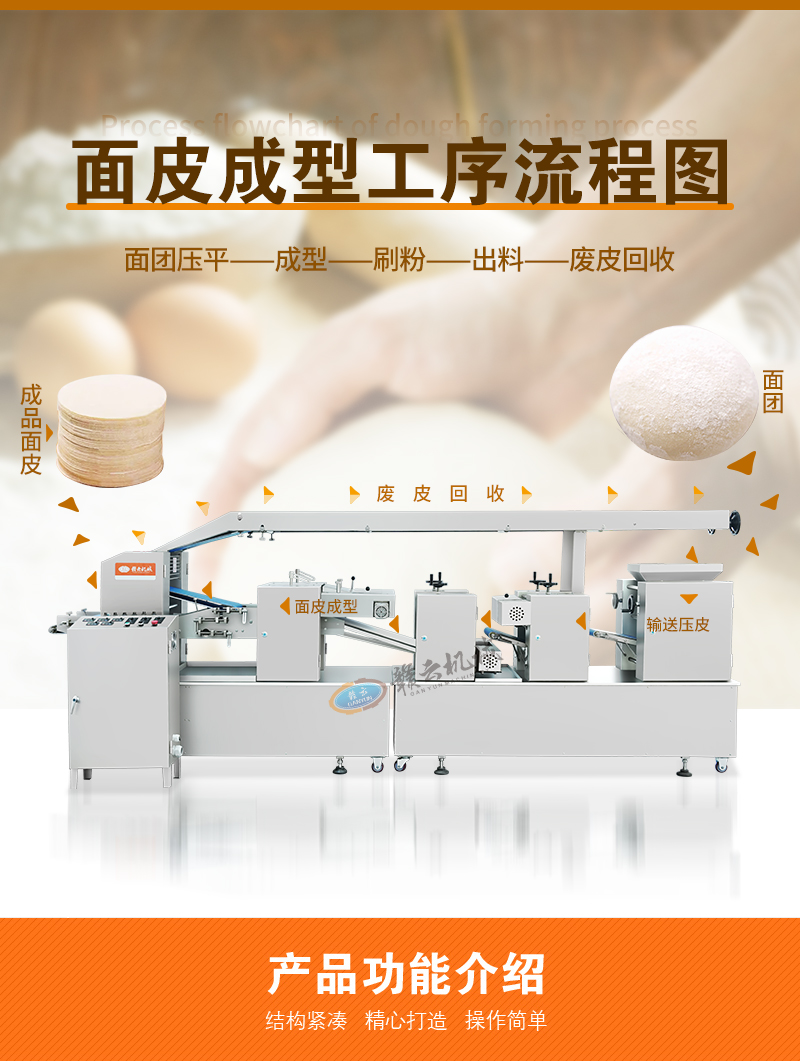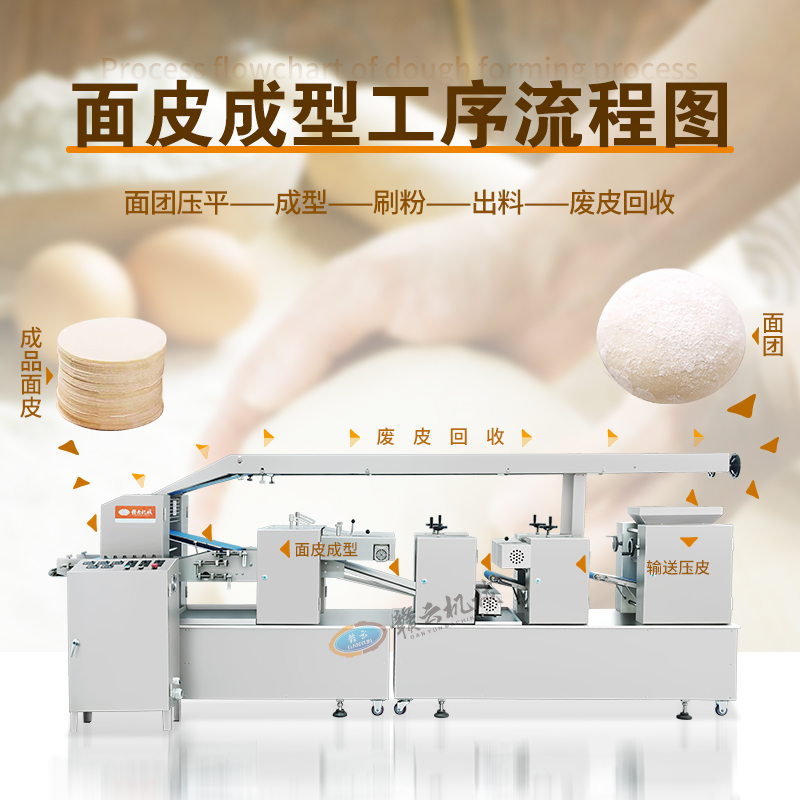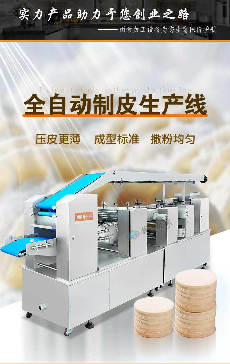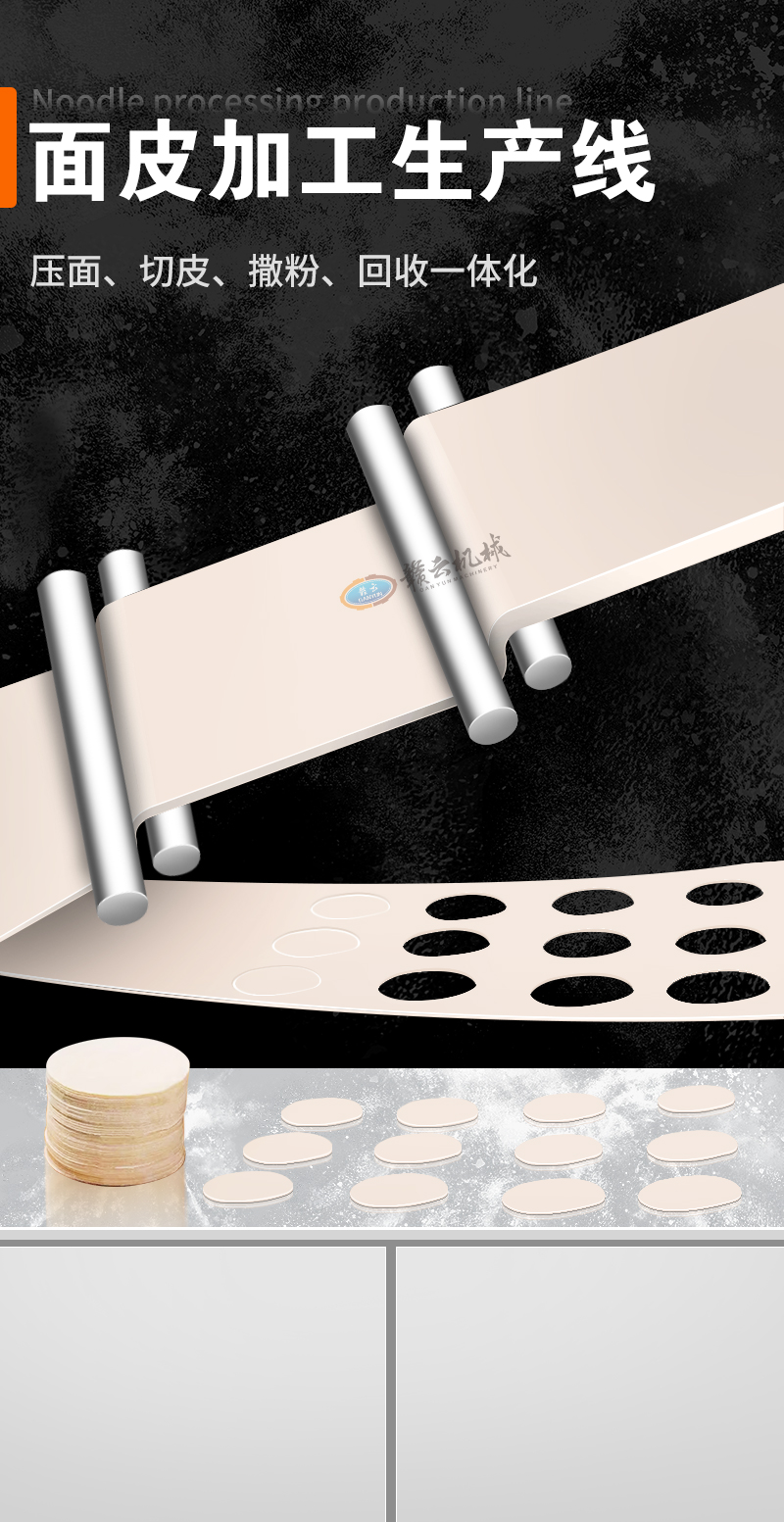 用于全自動面皮生產(chǎn),可加工生產(chǎn)餃子皮、餛飩皮、燒麥皮、包子皮等。