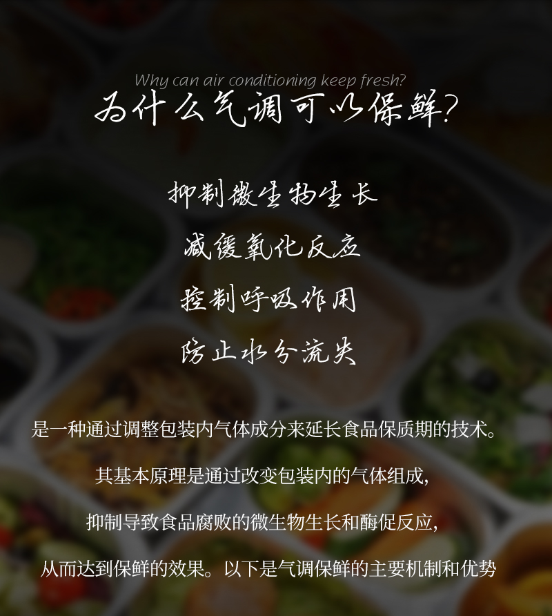 用于預制菜、熟食、果蔬等食品氣調(diào)保鮮包裝,通過調(diào)整包裝內(nèi)氣體成分延長保鮮期,保持色香味及營養(yǎng)。