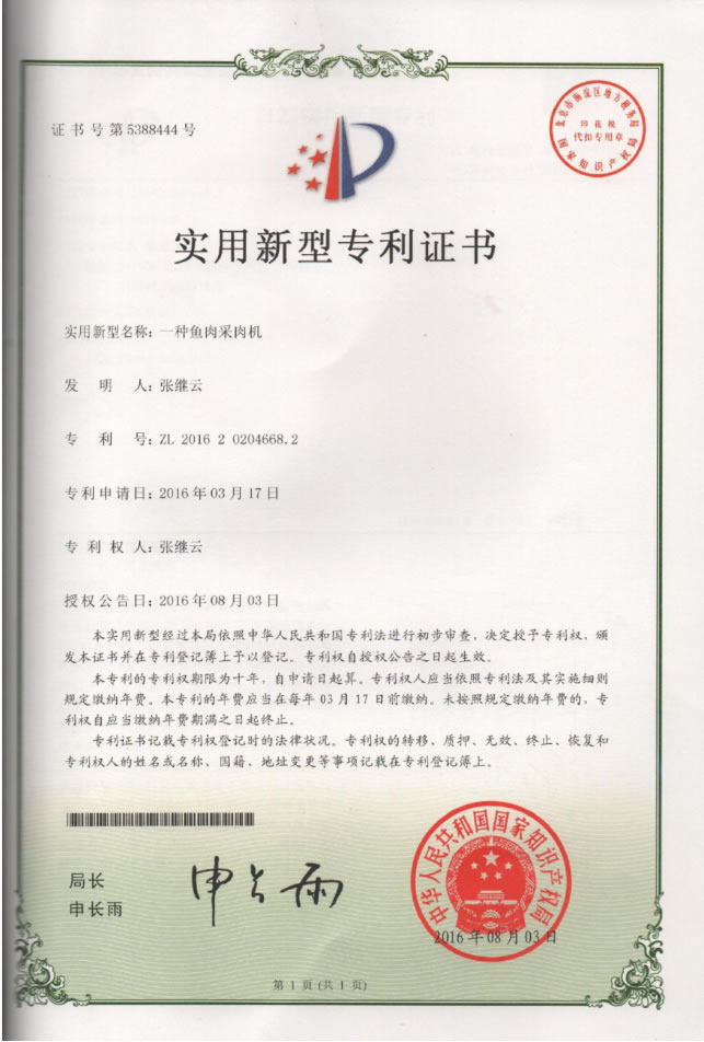 實用新型專利證書(魚肉采肉機)