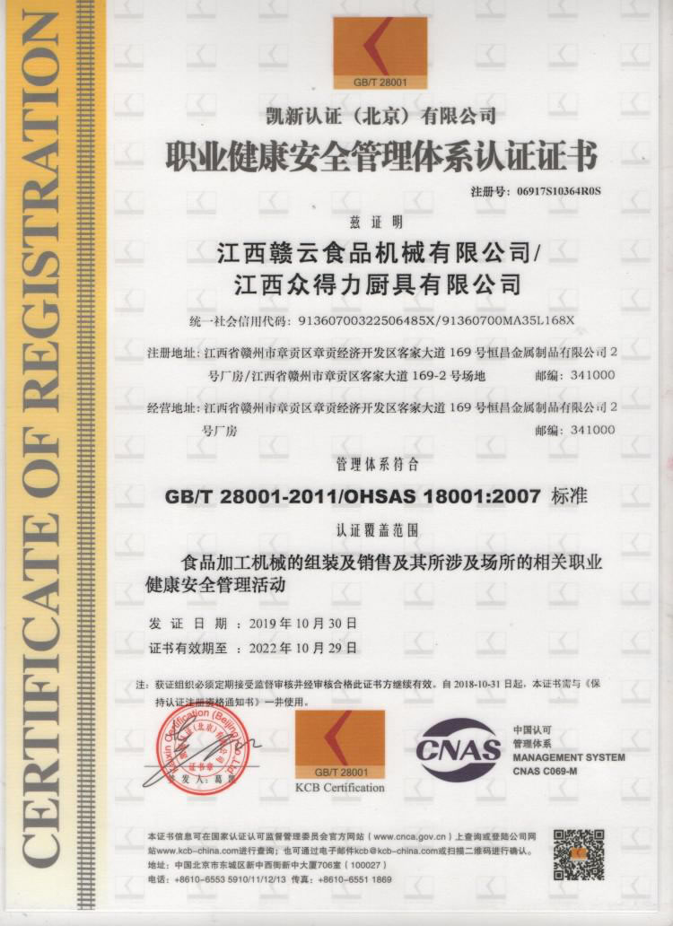 質量管理體系認證證書(ISO9001食品加工機械的組裝及銷售)