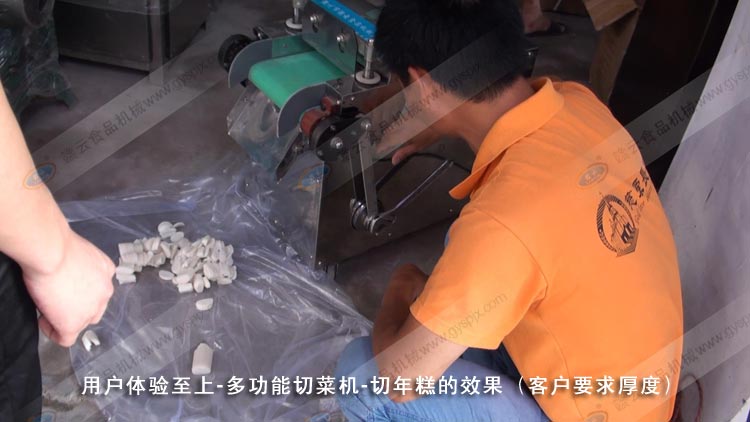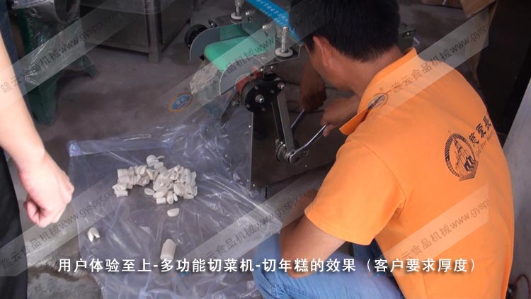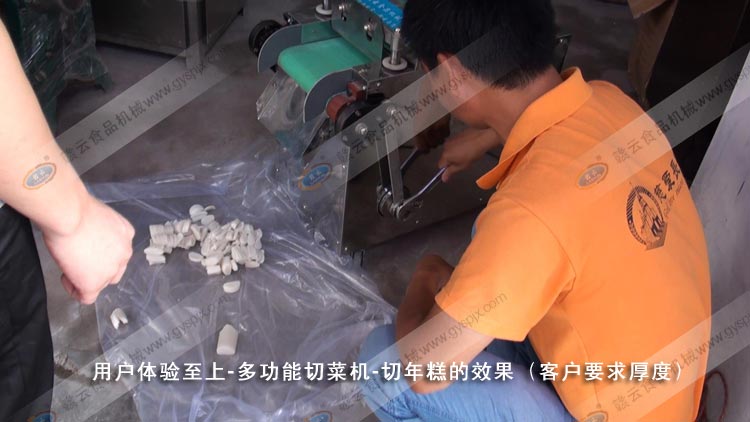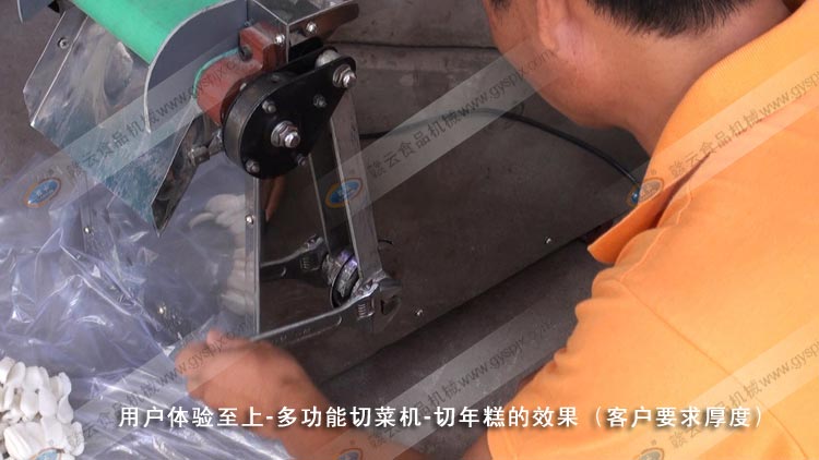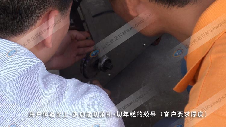 2012年6月27日上午,贛云接待了來自浙江溫州市王先生,體驗(yàn)多功能切菜機(jī)(GY-QC-660)切年糕片的效果,試機(jī)過程,贛云技術(shù)人員演示了切菜機(jī)的走刀量的調(diào)整,王先生也親自掌握了走刀量調(diào)整操作技術(shù)要點(diǎn),以下是試機(jī)過程實(shí)拍圖片: