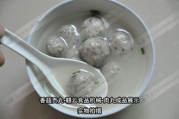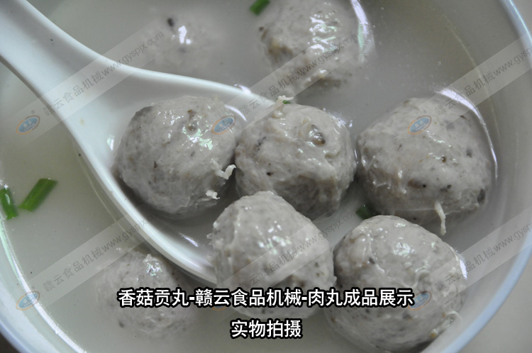 贛云食品機(jī)械肉丸成套設(shè)備的結(jié)晶,香菇貢丸,合作客戶獨(dú)家配方,用贛云牌肉丸設(shè)備制作的香菇貢丸,味美,有嚼勁,香菇原味,保證您吃了還想吃。香菇貢丸所需設(shè)備:自動絞肉機(jī)一臺,高速打漿機(jī)一臺,慢速打漿機(jī)一臺,食物切碎機(jī)一臺,貢丸機(jī)一臺,自動煮丸水槽一臺即可現(xiàn)做現(xiàn)賣,也可接單定做。相關(guān)設(shè)備的工作內(nèi)容:自動絞肉機(jī)碎肉,高速打漿機(jī)將肉?焖俅虺扇鉂{,慢速打漿機(jī)將肉漿調(diào)味,食物切碎機(jī)將香菇切成細(xì)小顆粒,放入慢速漿機(jī)中和肉漿一起調(diào)勻入味,貢丸機(jī)將肉漿成型貢丸,自動煮丸水槽將成型后的肉丸初步定型。批量的香菇貢丸就是這樣制作而成。