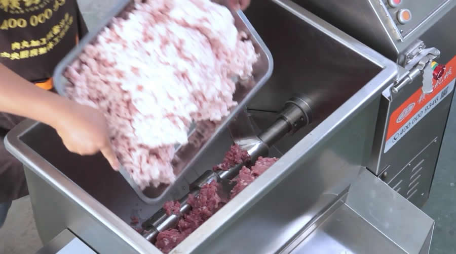 首先將所有原料準(zhǔn)備好,原料有:鮮豬肉(比例為:瘦6肥4)、胡蘿卜、生姜、小蒜、馬蹄、淀粉、冰水等。第一步是需要將原料通過(guò)絞肉機(jī)絞碎,這一步是使用贛云42型不銹鋼絞肉機(jī),這臺(tái)機(jī)器可以用于鮮肉、微凍肉類(lèi)、蔬菜等絞碎,機(jī)器動(dòng)力強(qiáng)勁,絞肉速度快,每小時(shí)可達(dá)600公斤。