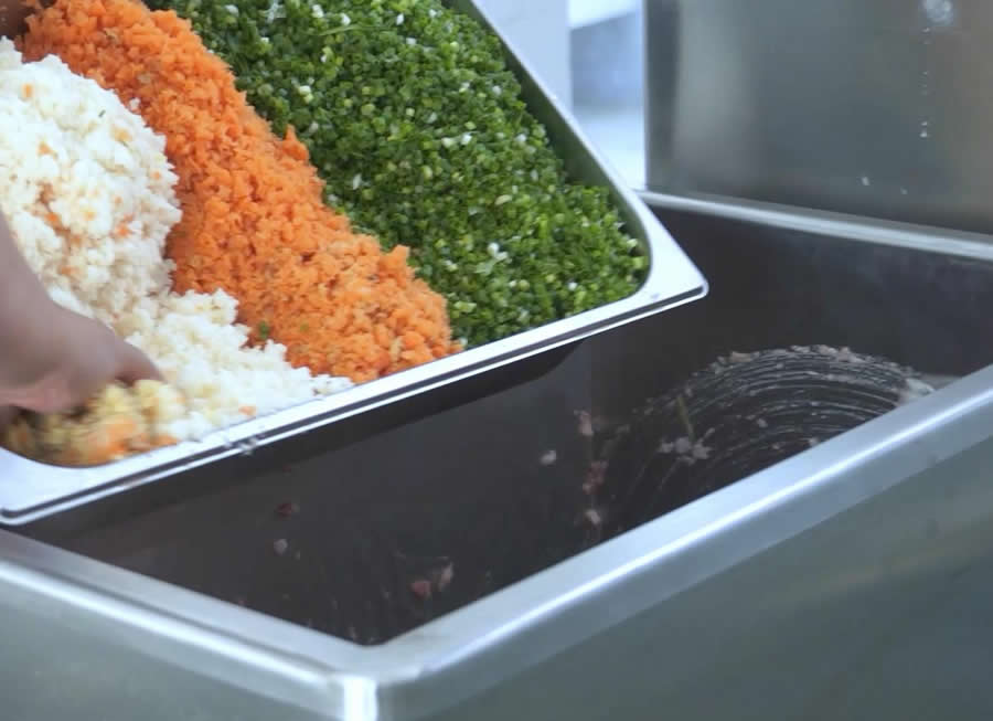 將通過(guò)絞切處理后的食材根據(jù)工藝比例倒入這臺(tái)自動(dòng)化不銹鋼拌餡機(jī)。拌餡機(jī)可對(duì)粒狀、粉狀、泥狀物料根據(jù)需求設(shè)定攪拌時(shí)間,機(jī)器擁有5槳交錯(cuò)攪拌,操作過(guò)程中可自動(dòng)切換正反轉(zhuǎn),這臺(tái)機(jī)器單次一桶可加工100L物料。