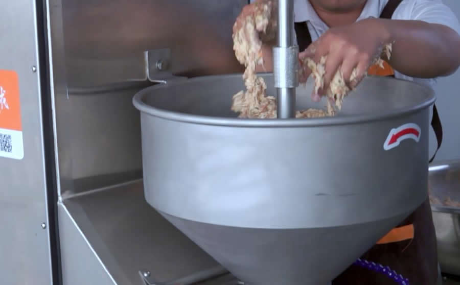 在將所有需要絞碎的原料通過(guò)絞肉機(jī)加工完成后,接下來(lái)這一步將使用贛云不銹鋼拌料機(jī),這個(gè)拌料環(huán)節(jié)就很重要,攪拌過(guò)程中的的添加的配料順序和攪拌時(shí)間都將會(huì)影響最后做出來(lái)的肉丸口感。