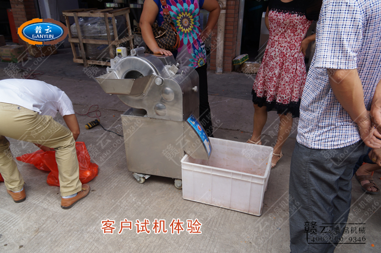 贛云牌130型果蔬切丁機迎來客戶新體驗,贛南地區(qū)某商戶加工土豆、胡蘿卜、香芋等,尋求能切15mm丁,5mm絲的機械設備,贛云工作人員為其推薦了130型果蔬專用切丁機,切丁刀組完全安裝,切出來就是丁,跟換切絲刀組就能切不同規(guī)格的絲了,試機效果良好,符合客戶加工需求。