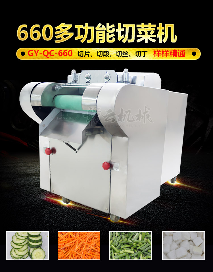 一機(jī)多用,擁用切菜機(jī)、切丁機(jī)、切絲機(jī)、切片機(jī)的功能,集多功能于一身?蓪⒏o類切成厚、薄片、絲條、丁等外形。葉菜類之輸送帶轉(zhuǎn)刀速度采用變頻器控制,獨立控制。成品形狀: 片、四角絲條、丁。