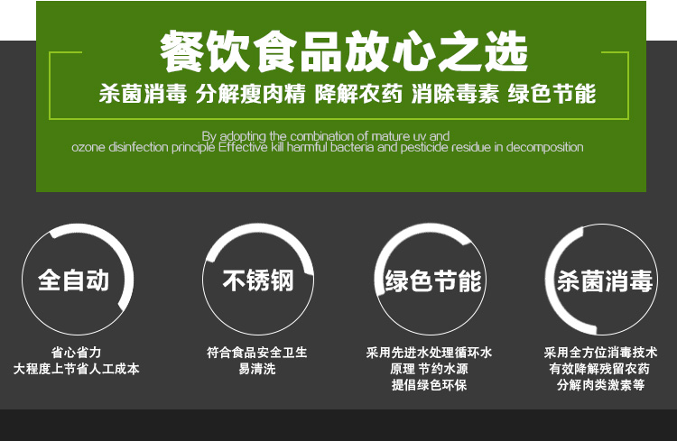 氣泡水循環(huán)臭氧洗菜機(jī),殺菌消毒,強(qiáng)力清洗,節(jié)約80%以上用水,采用沖擊波原理,能自動(dòng)將摘好的瓜果、蔬菜、肉類等食品表面清洗干凈,提高50%以上的工作效率,殺菌消毒采用紫外線和臭氧結(jié)合,有效殺滅有害細(xì)菌和分解農(nóng)藥殘留。密集活氧發(fā)布點(diǎn) 360度情急無死角。
