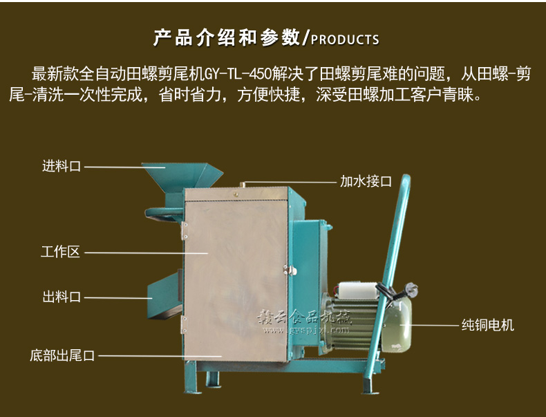 最新款全自動田螺剪尾機GY-TL-450解決了田螺剪尾難的問題,從田螺-剪尾-清洗一次性完成,省時省力,方便快捷,深受田螺加工客戶青睞。
