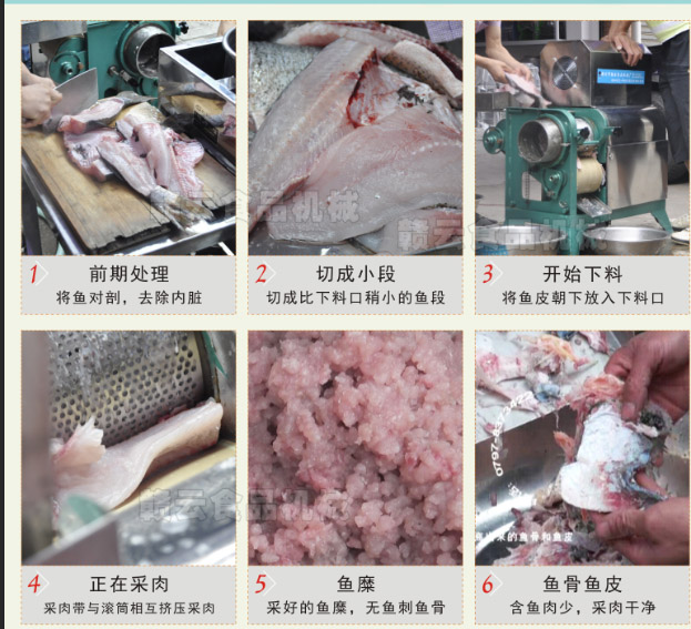 去刺是使用采肉機將魚體皮骨除掉而把魚肉分離出來。國內(nèi)使用較多的是滾筒式采肉機。