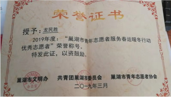 龍民勝同志還曾榮獲2019年度“巢湖市青年志愿者服務(wù)春運(yùn)暖冬行動(dòng)秀志愿者”榮譽(yù)稱(chēng)號(hào)。?