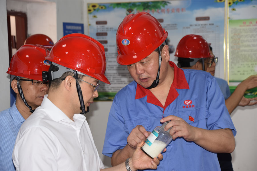 李中行來到皖維后,冒著高溫直奔生產(chǎn)現(xiàn)場,先后考察了公司PVA光學(xué)薄膜、PVB膠片、PVA樹脂等產(chǎn)品生產(chǎn)線,向陪同考察的集團(tuán)公司黨委書記、董事長吳福勝,黨委副書記、總經(jīng)理高申保了解產(chǎn)品性能、用途、生產(chǎn)情況。在PVA光學(xué)薄膜生產(chǎn)現(xiàn)場,李中詳細(xì)詢問了公司新材料產(chǎn)業(yè)技術(shù)研發(fā)成果、發(fā)展前景,以及產(chǎn)品替代引進(jìn)的先進(jìn)性等情況,并與各生產(chǎn)單位員工親切交談。