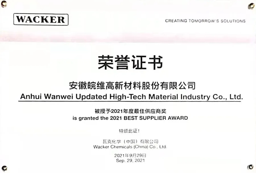 ? 瓦克化學(中國)有限公司的中國供應商日活動每2年舉行一次,按照“質量、服務、管理體系、可持續(xù)性發(fā)展”等領域進行評分,在眾多的中國供應商中,皖維高新以優(yōu)異的成績名列前茅,獲得瓦克化學(中國)有限公司的高度評價。