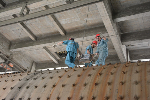 “高空作業(yè)”——圖為水泥分廠2#水泥磨上,工人們正在拆卸磨門